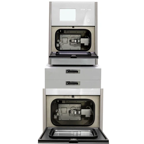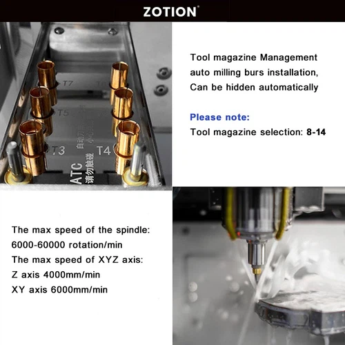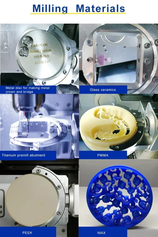 The Dental Lab Equipment Titanium Premill Abutment 5 Axis Wet Milling Machine can manufacture a variety of dental restorations (including crowns, bridges and abutments). The machine supports a wide range of milling materials, such as glass ceramics, titanium posts, titanium disks, PMMA and PEEK. The spindle operates in a speed range of 6000-60000 RPM, while the rotary axis provides +360° travel on the A-axis. Equipped with a tool magazine that can accommodate up to 14 tools with a shank diameter of 4×56 mm, it ensures flexibility in handling a variety of milling tasks. The machine has a rated power of approximately 650W and a maximum operating speed of 4000 mm/min on the Z axis and 6000 mm/min on the XY axis, allowing for efficient and precise milling. Its 5-axis milling technology with an accuracy of ±1° can provide high-precision results.